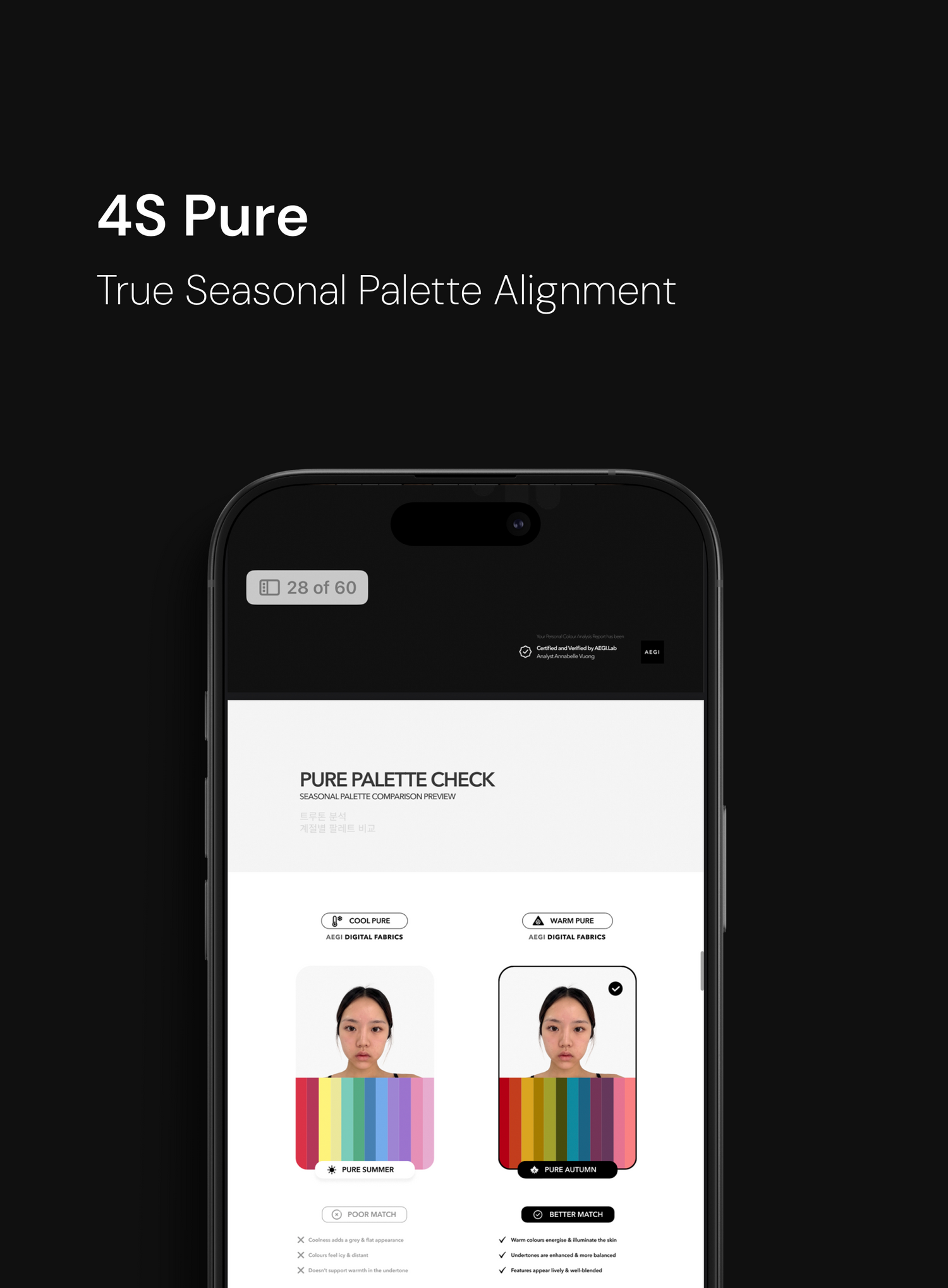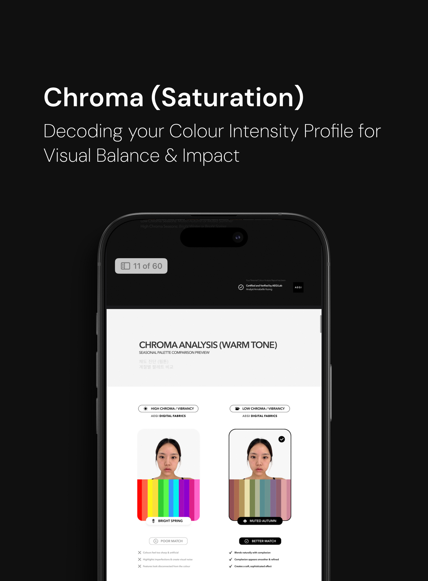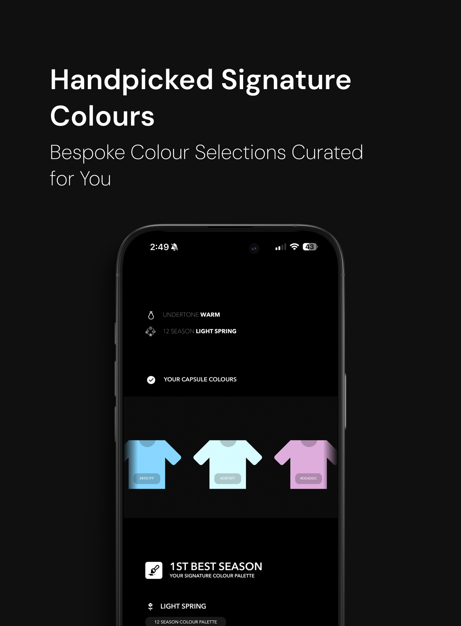 Your personal palette is custom-built for your skin tone, undertone, and features. These aren’t just trends; they’re your forever colours - bespoke, trademark and signature colours designed to enhance you and only you. Distinct, unforgettable, uniquely you.